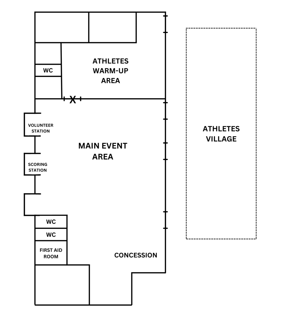 Please familiarize yourself with where everything is on Games day. Note that the Athletes Warm-Up Area is separate from the Main Event Area. You will need to go around and back in.