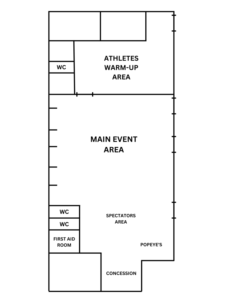 Here’s the floor plan for Games day! The area where spectators can watch the action will change for each workout so please follow the instructions of the judges and Team members.