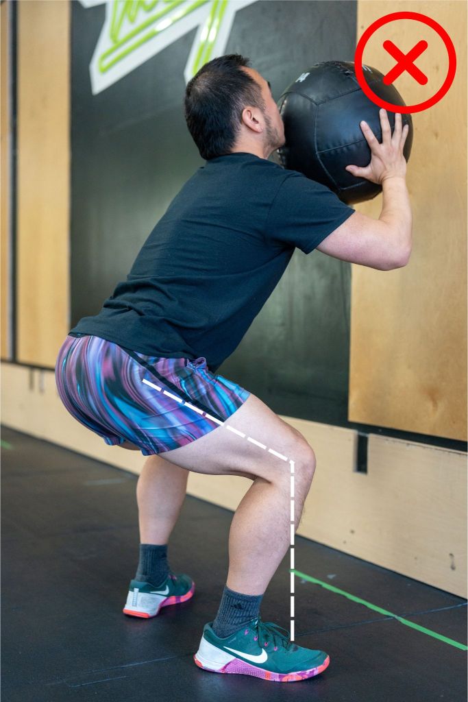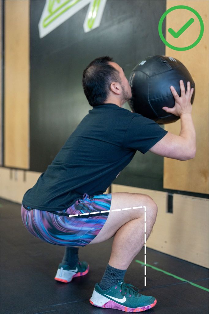 Athletes must ensure that their hips hit below parallel at the bottom of the squat while performing their wall ball attempts. Failure to do so will result in a no rep.