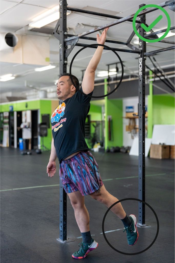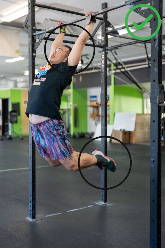 Athletes must ensure arms are fully extended and feet are behind the rig at the bottom of the toes-to-bar movement. Failure to do so will result in a no-rep.