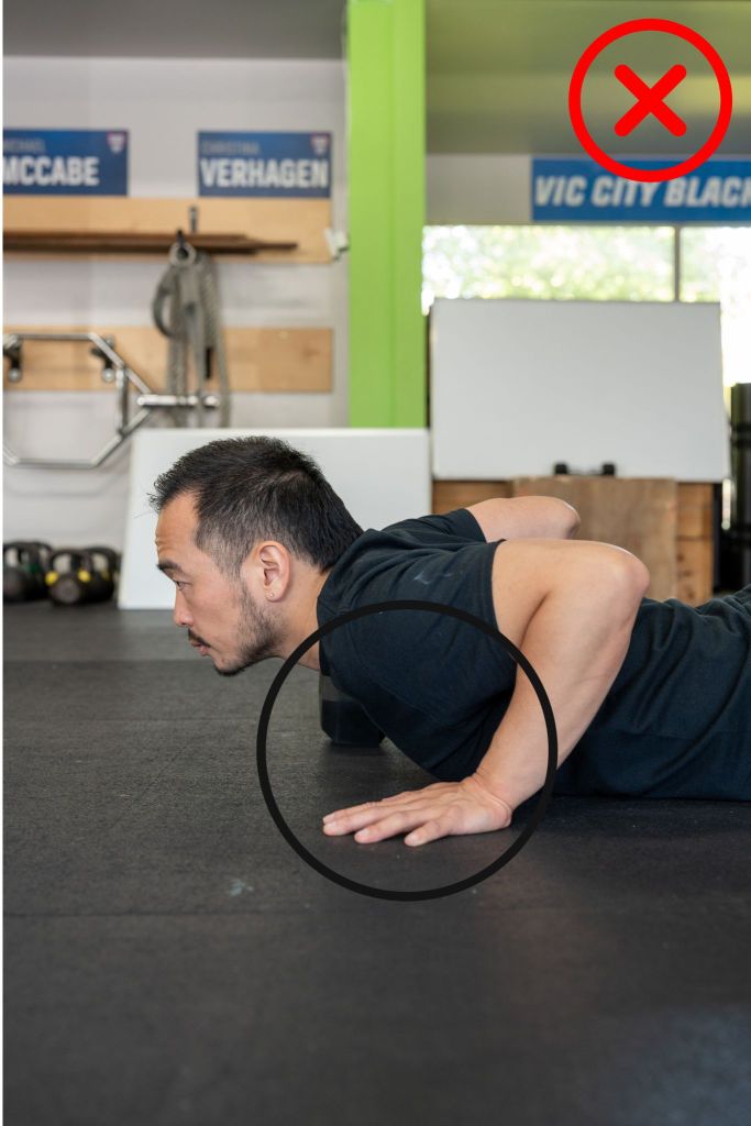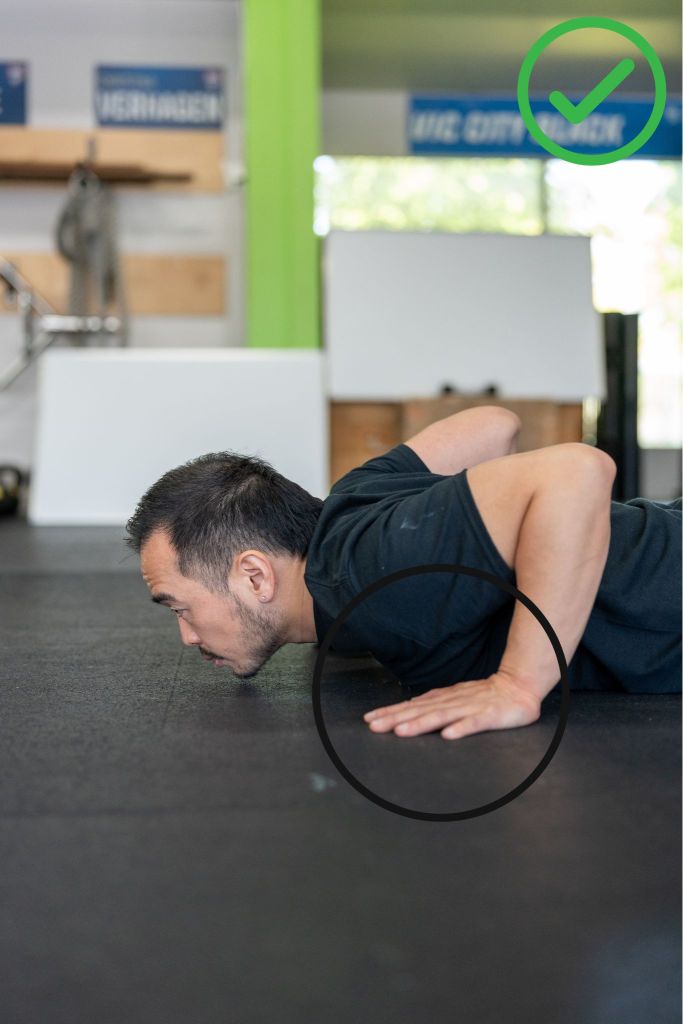 Athletes must ensure their chest makes contact with the floor when performing the push-up portion of the single-arm devil’s press. Failure to do so will result in a no-rep.