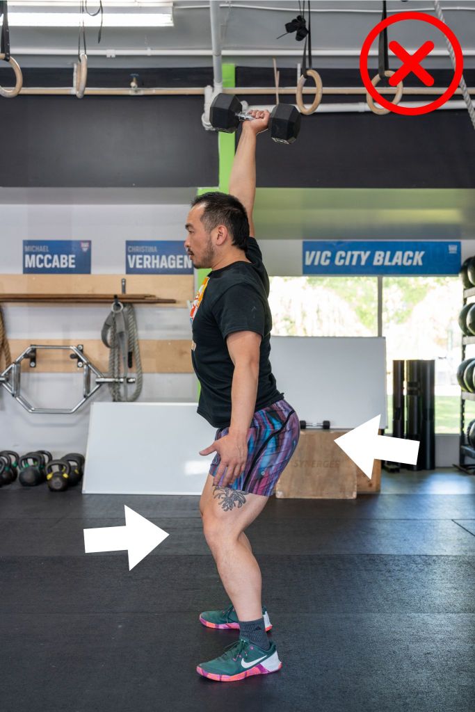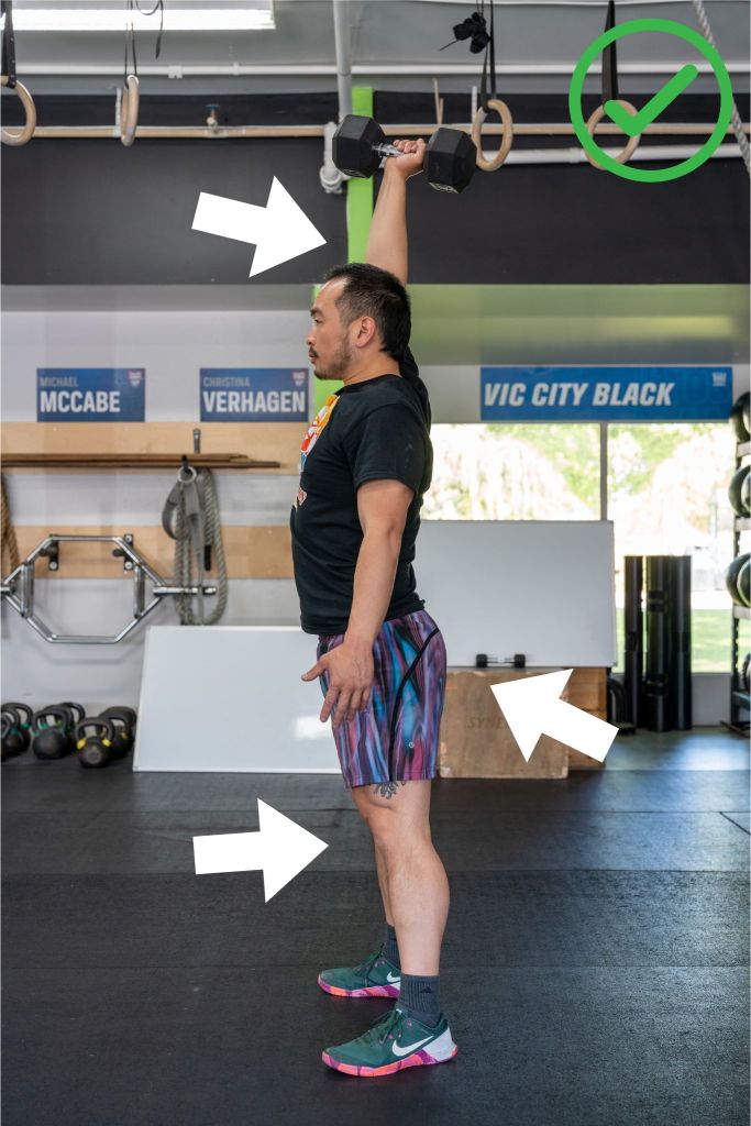 Athletes may dip under when attempting to bring the dumbbell overhead, but then must complete the movement with arms and legs fully extended and hips through. Failure to do so will result in a no-rep.
