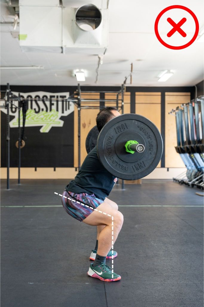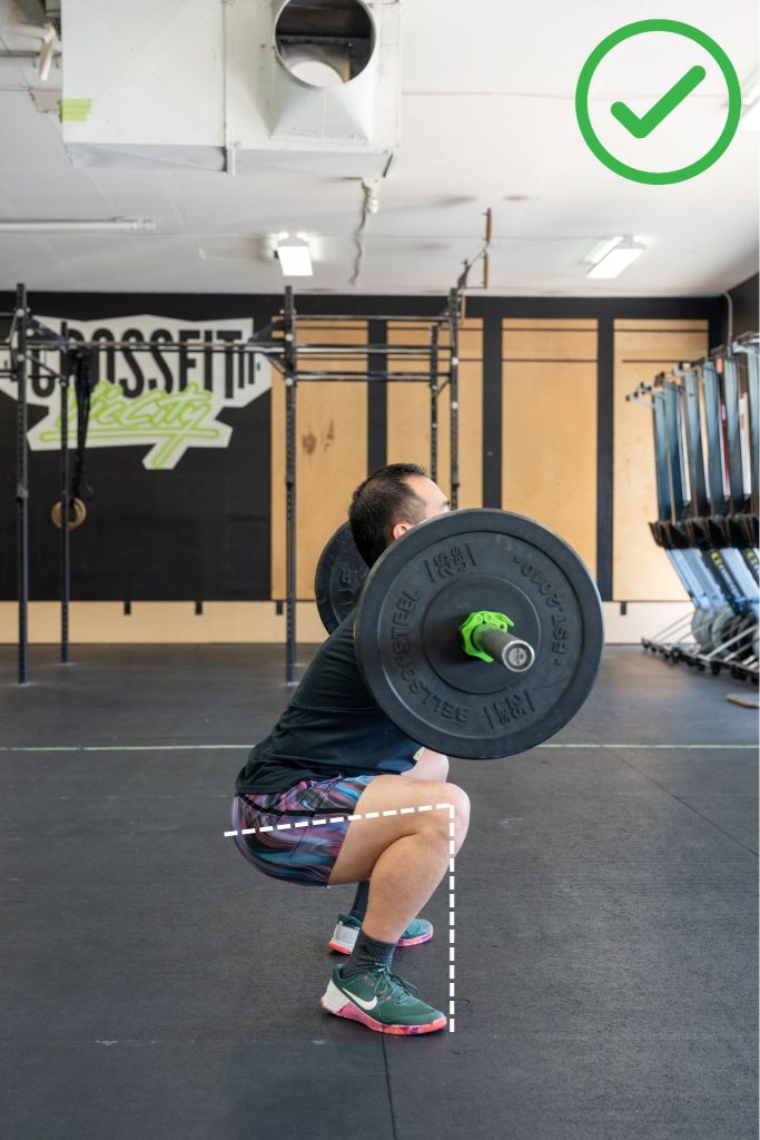 Athletes must ensure hips are below parallel at the bottom of the thruster movement. Failure to do so will result in a no-rep.
