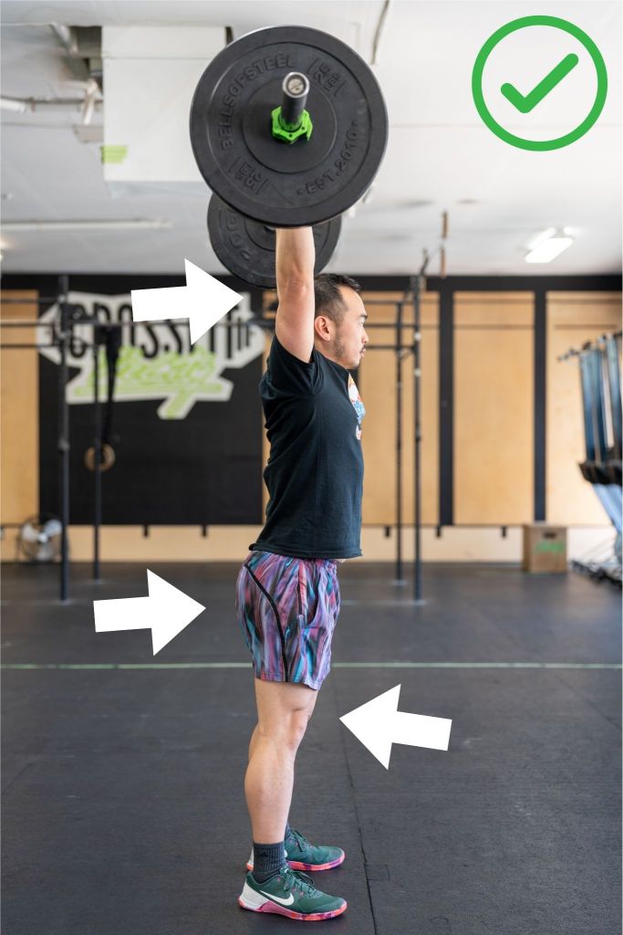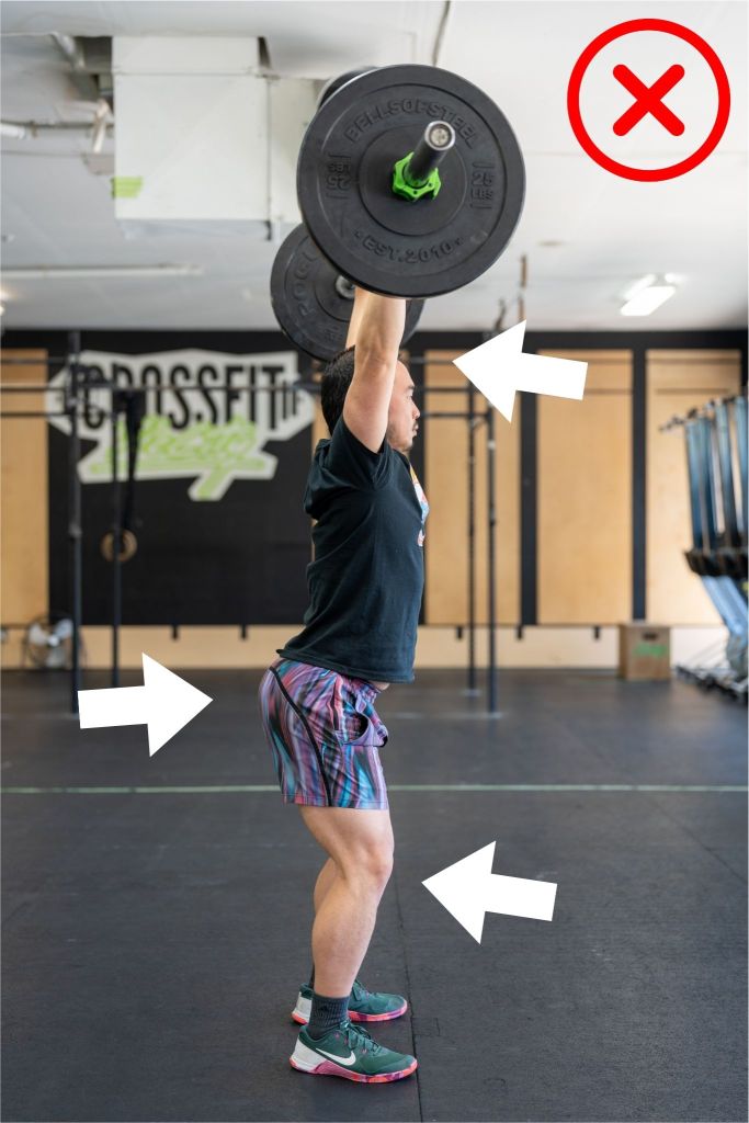 Athletes must bring the barbell overhead in one movement ending with a full lock out at the top. Athletes are not allowed to dip under the bar when it is overhead. Failure to reach and maintain full lock-out at the top, with the weight overhead (and not in front), will result in a no-rep.