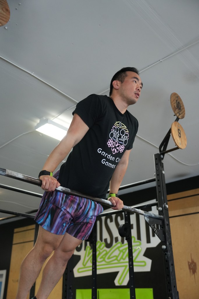 A rep begins with the athlete grabbing the pull-up bar with both hands, with their arms fully extended and their feet off the ground. A rep is credited when the athletes clearly makes contact with the bar below the collarbone.