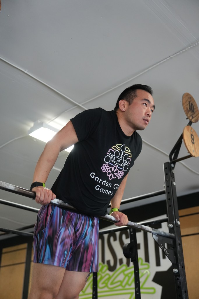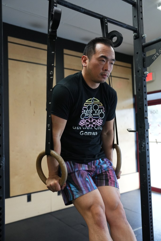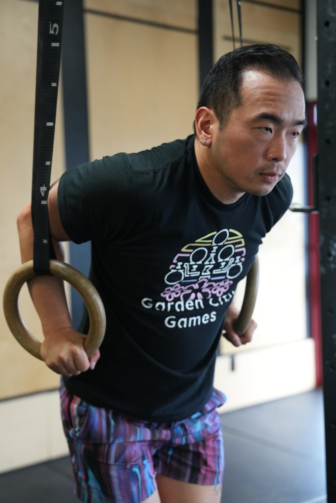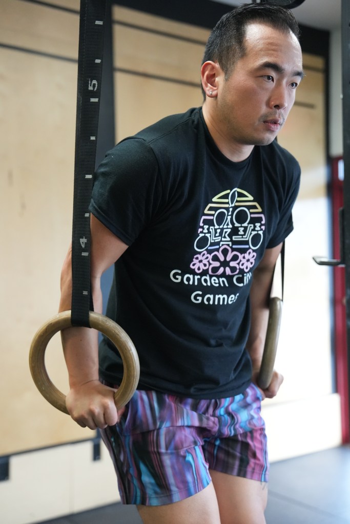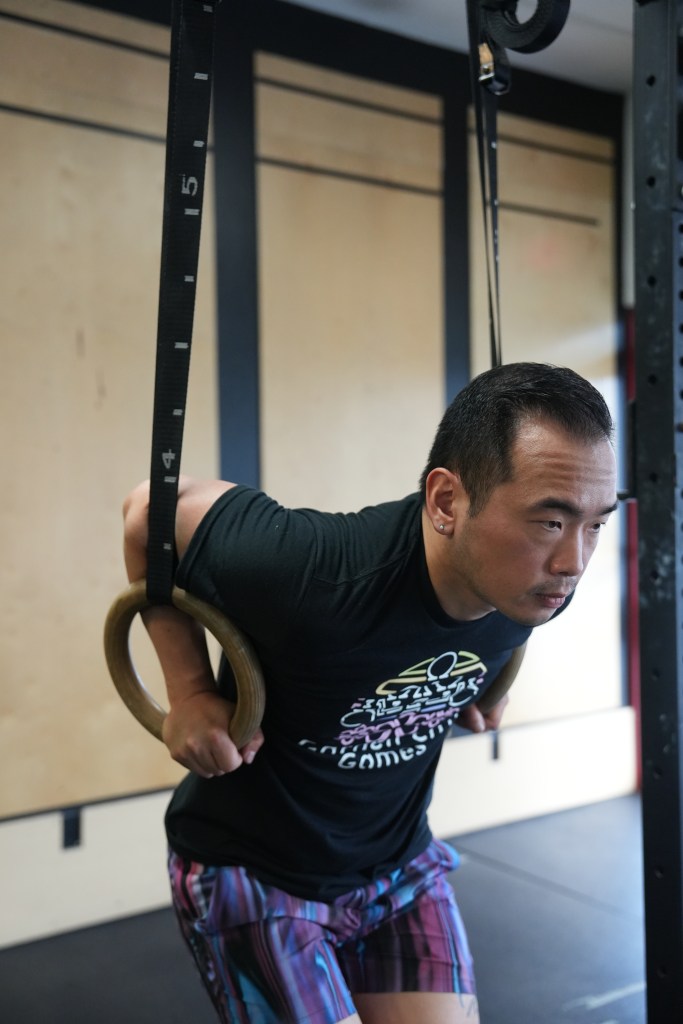 A rep begins with the athletes grasping the rings with arms fully extended. The rings must make contact with the athletes’ shoulders at the bottom of the movement.