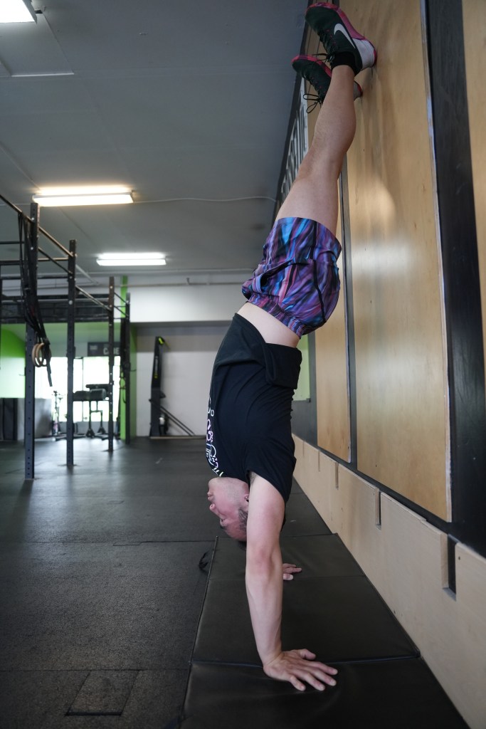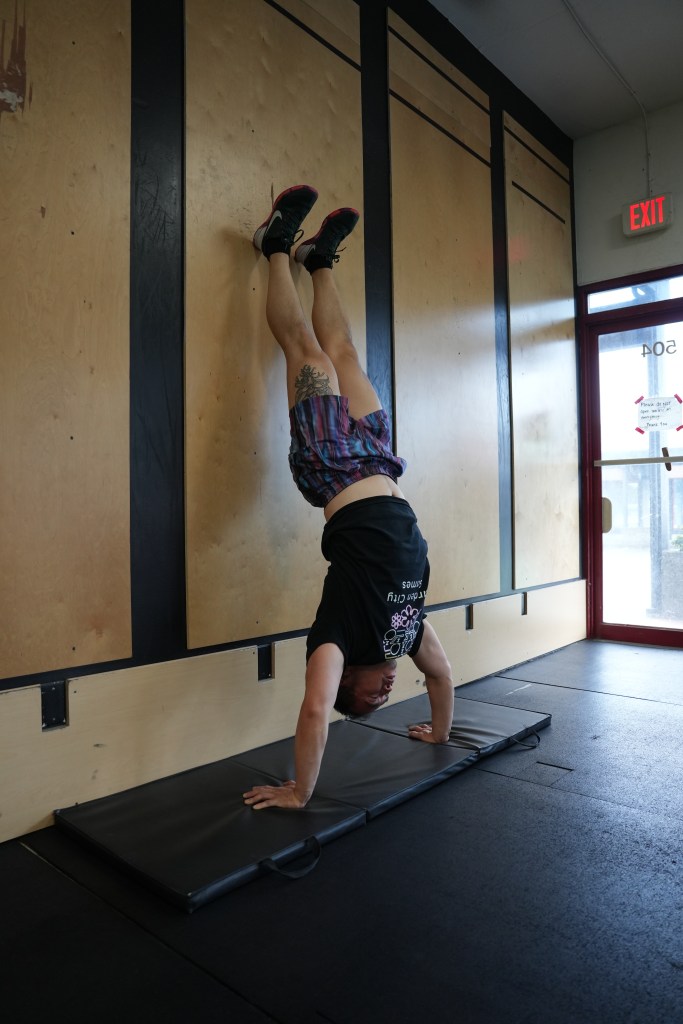 A rep begins with the athletes in a handstand position, where the arms are locked out and both heels are touching the wall. A part of the athletes’ hands (both) must be touching the 10-inch line on the floor. Next the athlete must touch the mat on their descent, followed by whatever push-up variation of their choosing. A rep is credited when the arms are fully locked out and shoulders are open.