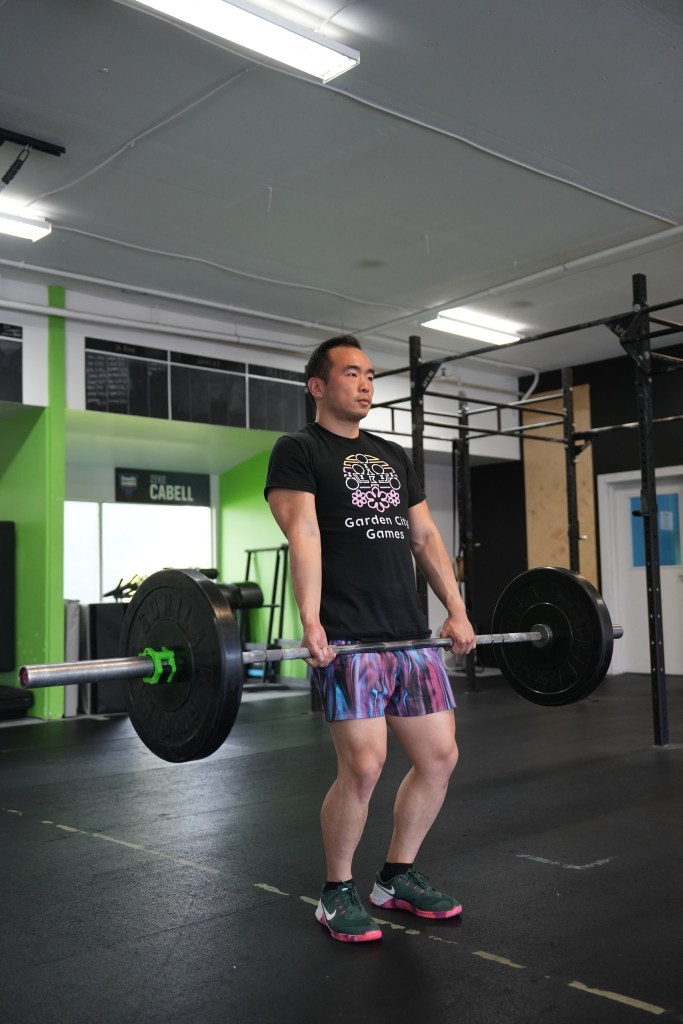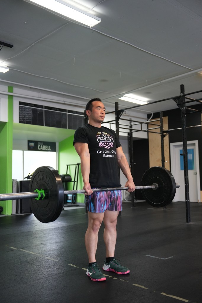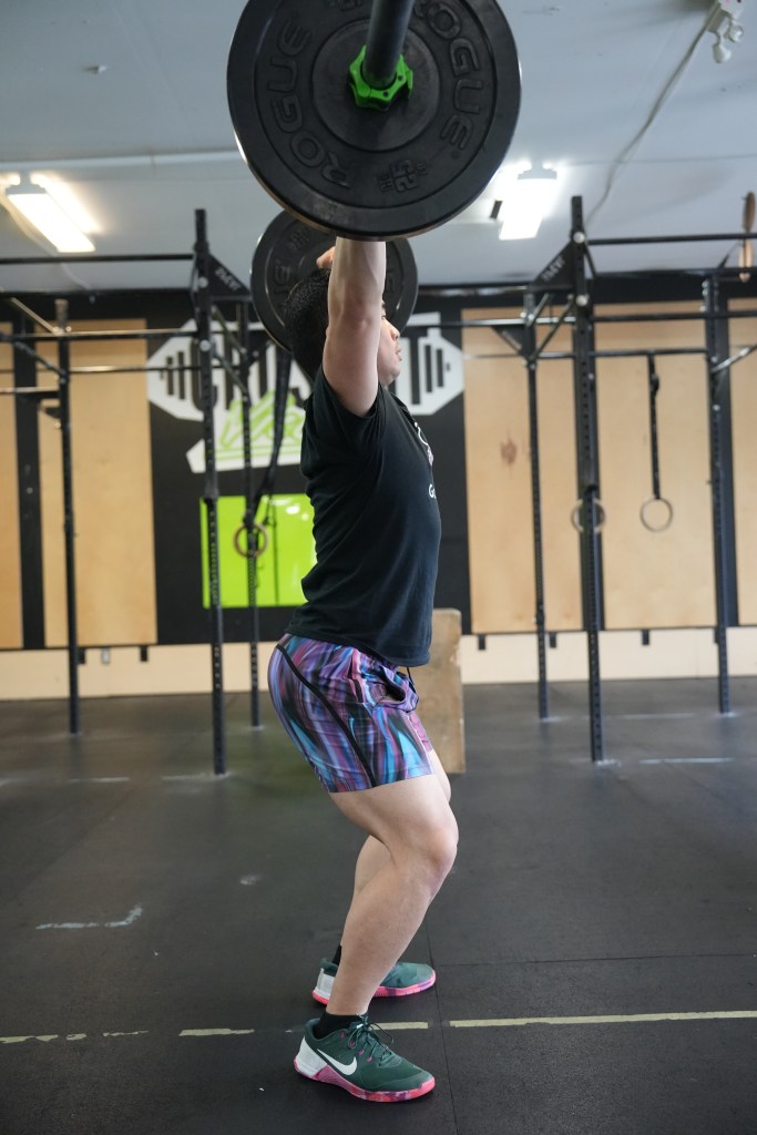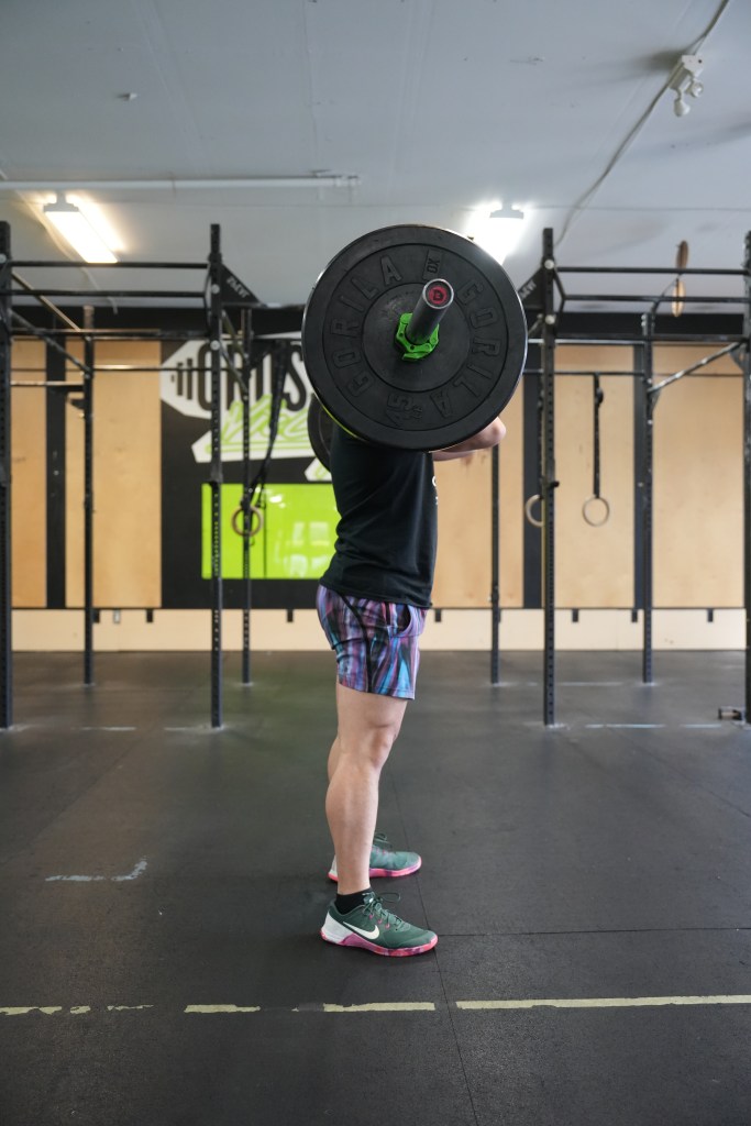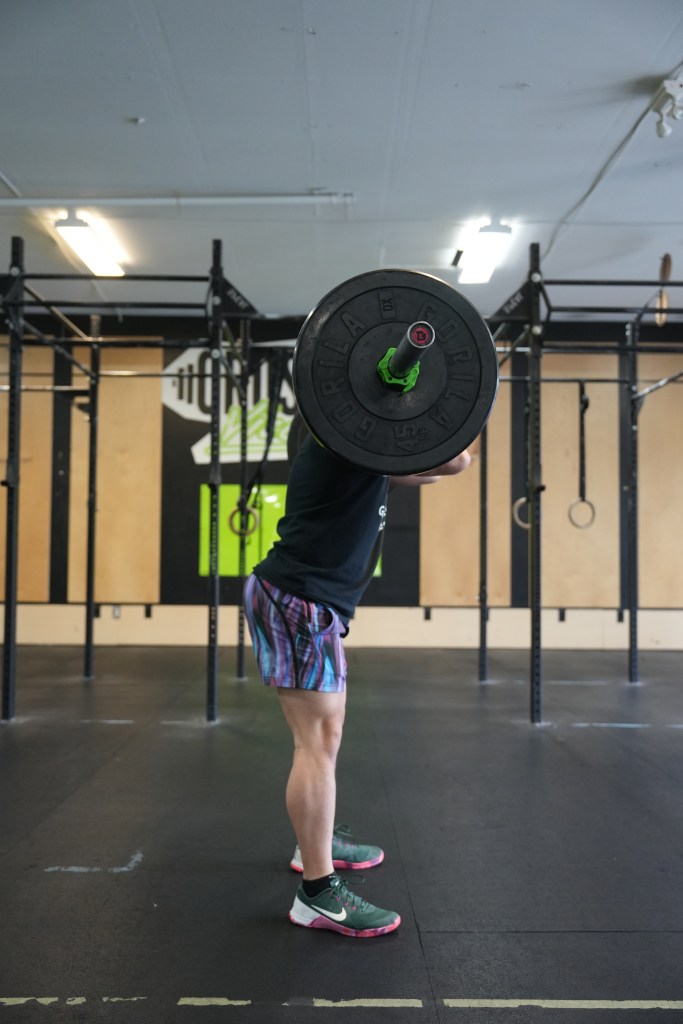 Athletes will start with the barbell on the floor. A rep is credited when the bar is resting on the shoulders followed by a full lock-out position when standing up where the body is stacked vertically. Failure to do so will result in a no rep.