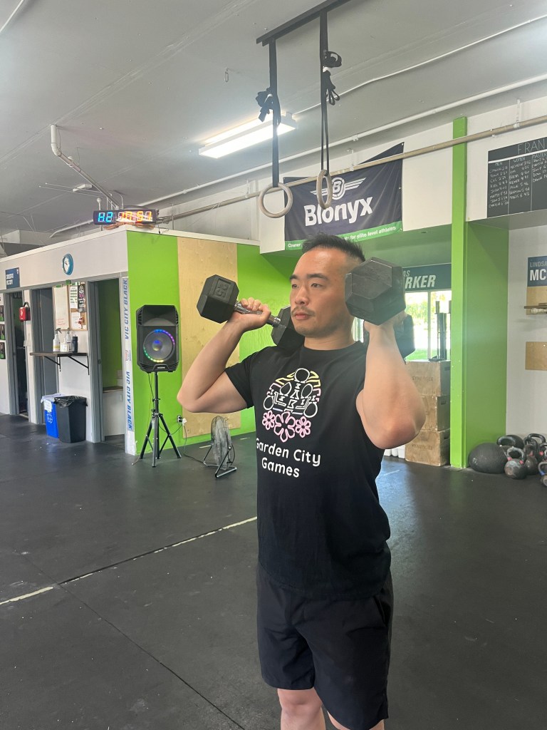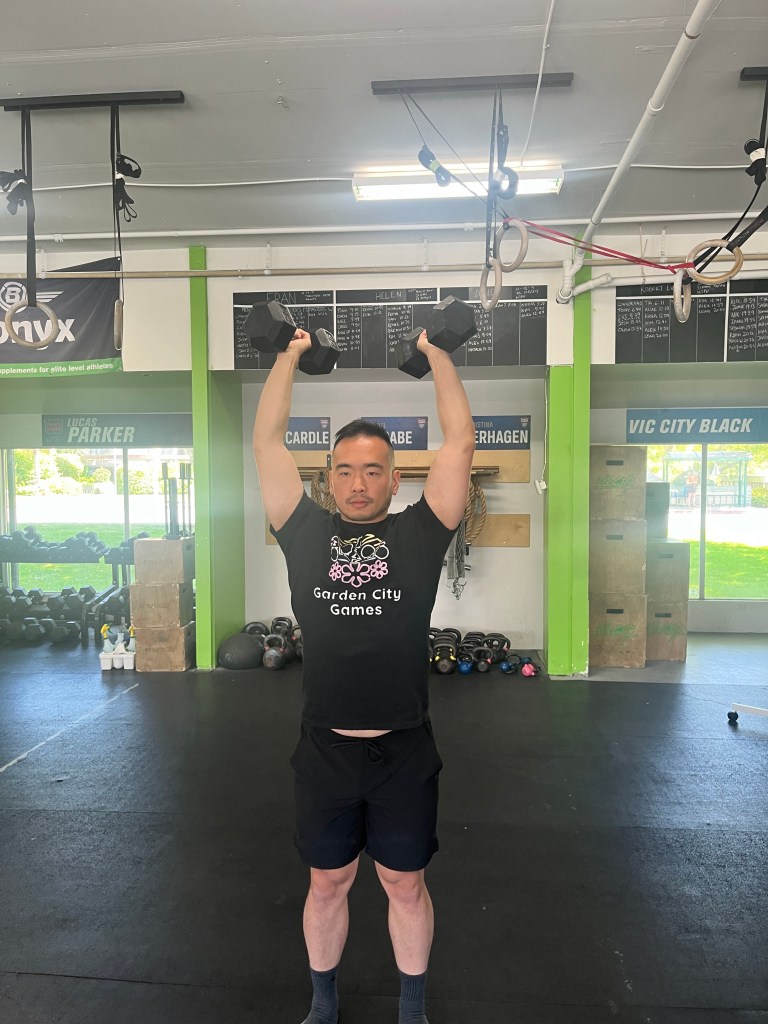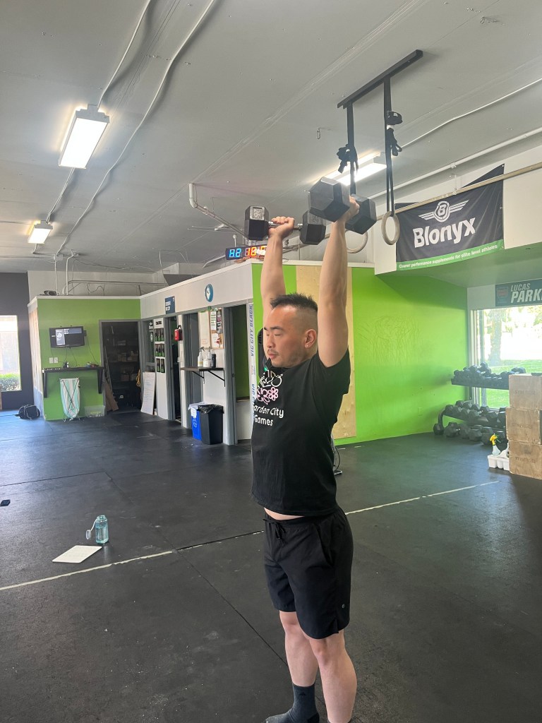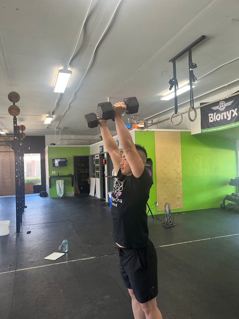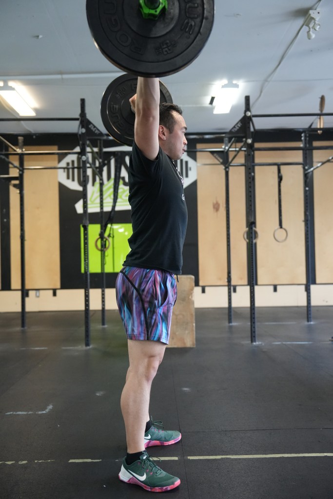 Athletes are not allowed to utilize their lower body to help with lifting the dumbbells. Athletes must also ensure full lock-out at the top, with the dumbbells above or slightly behind the shoulders. Failure to do so will result in a no rep.