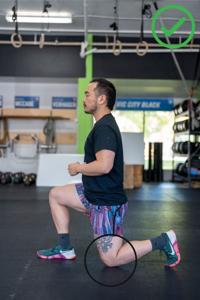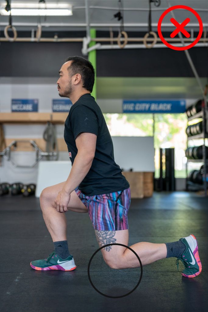 Athletes must ensure that the knee on the back leg makes contact with the ground at the bottom of the walking lunge. Failure to do so will result in a no rep.